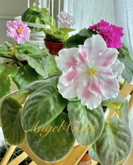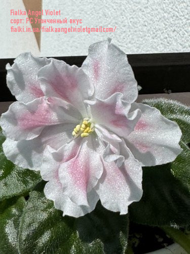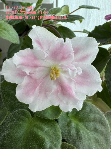 Фиалка (сенполия)Фіалка РС-Витончений Смак (селекціонер С. Рєпкіна) - популярний сорт з дуже великими (до 7-8 см) білими, біло-рожевими махровими/напівмахровими квітами з хвилястими краями. Відмінна риса - ніжні персикові надруки на пелюстках, що темніють до центру. Розетка акуратна, середньо-зелена, цвітіння рясне та раннє