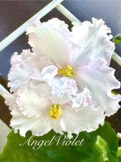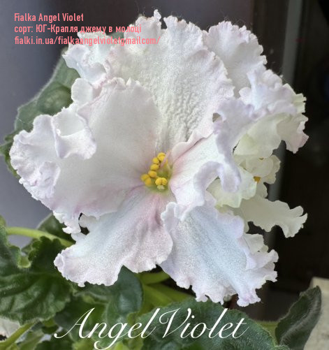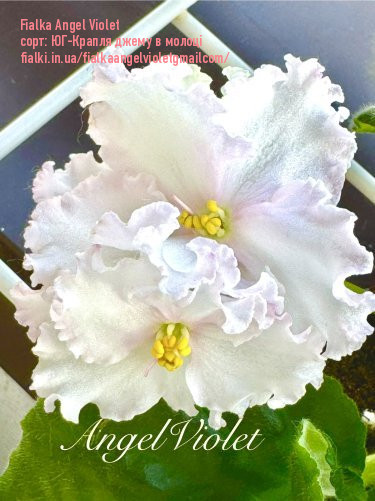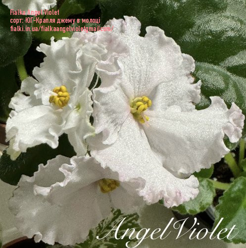 Фиалка (сенполия)ЮГ Крапля джему в молоці — ніжний сорт сенполії з великими хвилястими квітами молочно-білого кольору, прикрашеними легкою рожевою «розтушовкою» від центру та ледь помітною рожевою облямівкою по краю. Пелюстки гофровані, повітряні, що надає квітам особливої легкості. Розетка компактна, з темно-зеленим листям. Цвітіння рясне та тривале, сорт виглядає дуже делікатно й романтично!