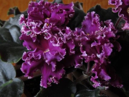 Большие фиалковые полумахровые насыщенные малиново-фуксиевого цвета с гофрированными лепестками и бахромчатыми краями. Лист тёмно-зелёный. Обильное и длительное цветение. Стандарт.Крупные пышные ярко-малиновые полумахровые и махровые цветы с белой бахромой по краю.