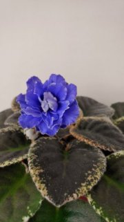 Фиалка (сенполия)Б. М. и Т. Н. Макуни. Крупные полумахровые, махровые синие звёзды, по краю белая гофрированная кайма. Цветки возвышаются над компактной, с прямыми листьями розеткой.