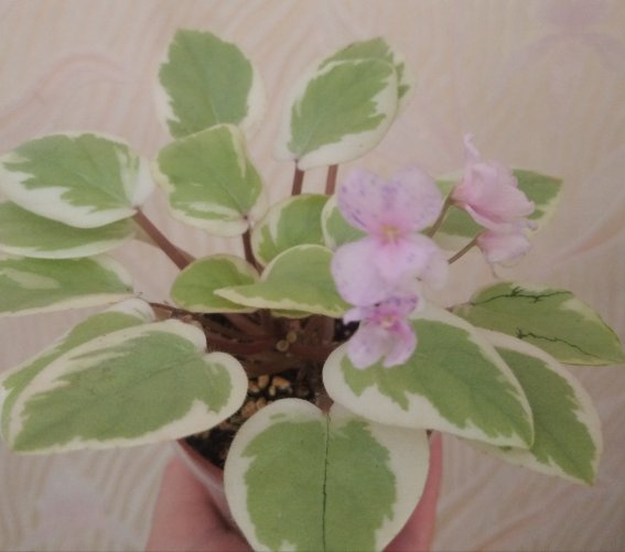 Фиалка (сенполия)Полумахровые светло-розовые цветки с мелкими черточками синего фэнтези; средне-зеленая, ровная листва. Полуминиатюрный трейлер. Идеален для начинающего цветовода