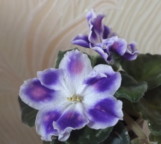 Фиалка (сенполия)Селекционер: Морев К. Цветок: Полумахровые сине-фиолетовые звезды с большим белым пятном в центре. Широкая белая кайма, идущая по краю лепестков, придает ей особое очарование. Края лепестков слегка волнистые. Цветет большой шапкой. Хорошо цветет при различных условиях. Прост в содержании. Розетка: Листья зеленые, слегка удлиненные. Размер: Стандарт