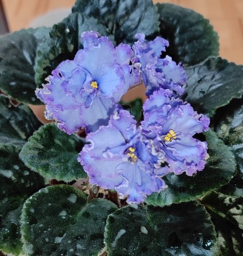 Фиалка (сенполия)Очень крупные, полумахровые, синие звёзды с глубоко-гофрированными лепестками с прерывистым белым кантом. Цветы образуют ровную шапку над аккуратной тёмно-зелёной розеткой. Стандарт