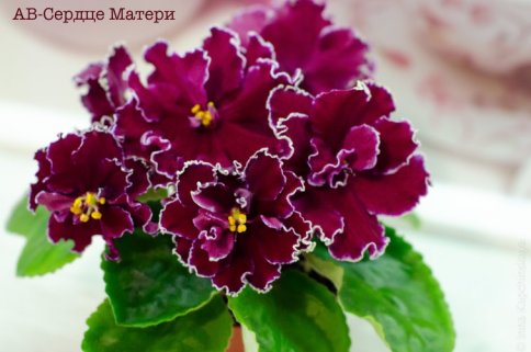 Огромные волнистые контрастные простые и полумахровые темно-пурпурные звезды с белой каймой. Слегка волнистые средне-зеленые листья. СтандартАВ-Сердце Матери є в колекціях користувачів: fialkiodessa, dreemflowersyk, jsjuliashavlak, mayflowers, kapchinskaya, nataliabuno, olenatrofimchuk, tatianayurchenko, ZoryanaTrush, svetlana, natalyanoskova, svetlanavlasenko, natashaburba, khmaramarina, anastasia, viktoriya, ekaterinaperebajlo, kalashnikovaolene, valentinamantik, dolena