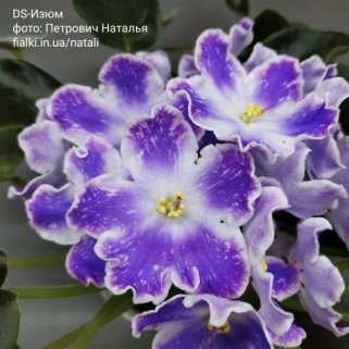 Сине-фиолетовый цветок с белыми штрихами по цветку и с широкой белой каймой на волнистых кончиках лепестков. Белый глазок в центре. Малиновая окаймляющая полоса на границе белого и основного тона проходит в центре и на краях лепестков. СтандартDS-Изюм є в колекціях користувачів: natali, fialkiodessa, serova, fialki, mayflowers, chugaevasvetlana, fialochki, liliyafialochka, olganazarenko, fialochkatamaraponomarenko, viktoriyaanatolevna, jsjuliashavlak, nataliabuno, yuliyan, galinakor, ksyunya, natashaburba, nataliyadzekar, switlanafialka, kalashnikovaolene