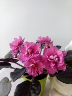 Очень крупные махровые огненно-коралловые цветы с пурпурным фэнтези и пурпурной каймой напылением. Лепестки красиво отогнуты внутрь цветка, как у розы. Удлинённо-заострённые тёмно-зелёные листья.ЕК-Огненный Фейерверк є в колекціях користувачів: fialkiodessa