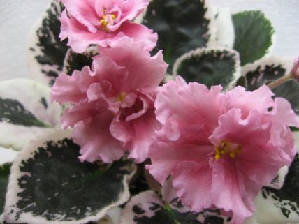 Цветы крупные, махровые, персиково-розового цвета с более тёмным центром. Букетное цветение. Очень аккуратная и красивая розетка. Пестролистник. СтандартКрупные махровые и полумахровые волнистые розово-коралловые звёзды с более тёмным пятном в центре. По мере взросления цветка его цвет меняется на более тёплый. Ровные тёмно-зелёные листья с бело-розовой окаймляющей пестролистностью образуют красивую розетку.