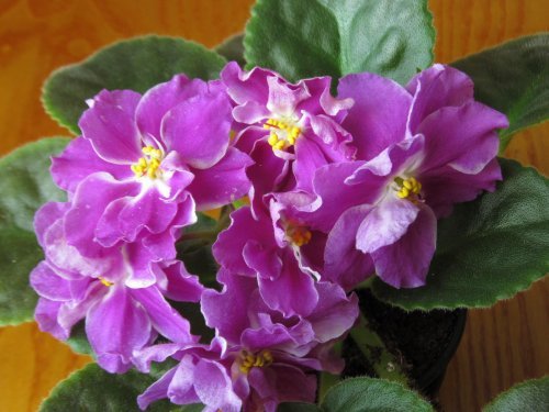 Очень крупные шарообразные густо-махровые двухтоновые сиренево-фиолетовые цветы кажутся пушисто-меховыми на фоне выставочной тёмно-зелёной розетки.