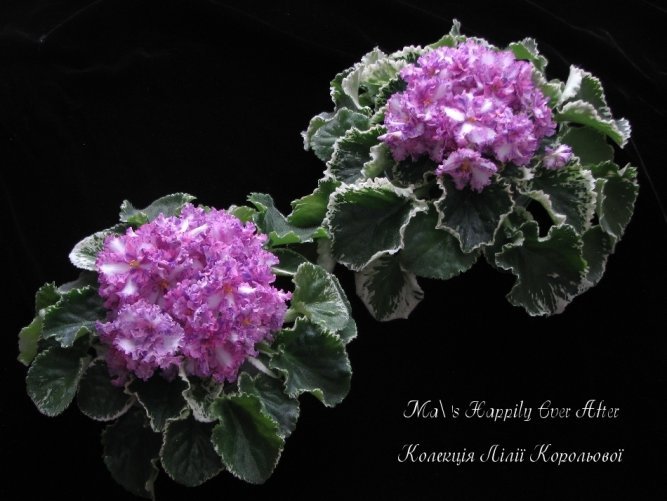 Крупные махровые белые звезды с сиренево-розовым фэнтези по гофрированной кайме лепестков. Аккуратная розетка, средне-зеленые слегка волнистые листья. Стандарт. (описание селекционера) -