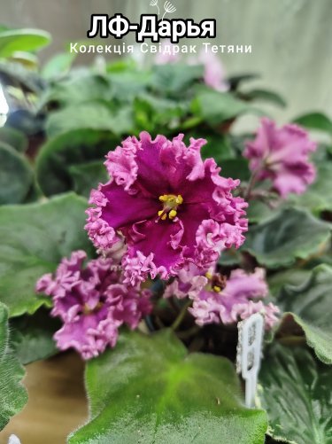 Ніжно фіолетово -бузкові напів прозорі махрові квіти . Строкате листя ,злегка загострене .Стандарт