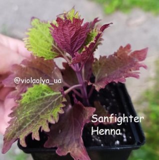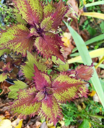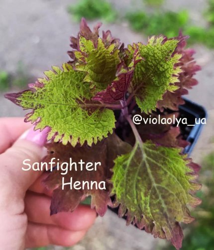 Махрові темно-пурпурні зірки з тонкою білою облямівкою. Зубчасте темно-зелене листя з оранжево-золотистою строкатістю. Напівмініатюра.